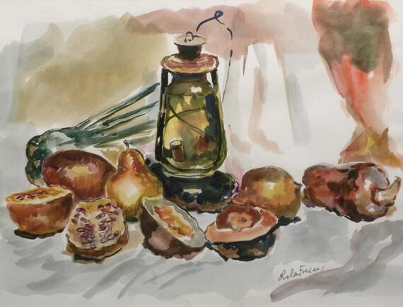 FREXAS LOLA, Naturaleza muerta con farol, acuarela, 45 x 35 cm